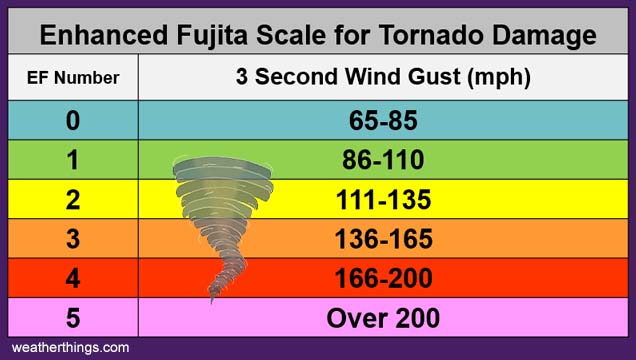 After a tornado passes, we measure how much damage it made and then compare it to the Enhanced Fujita Scale. The Enhanced Fujita Scale or EF-Scale is named after a famous Japanese tornado research scientist, Dr. Ted Fujita. The weakest tornadoes are EF-0 and the strongest are EF-5.